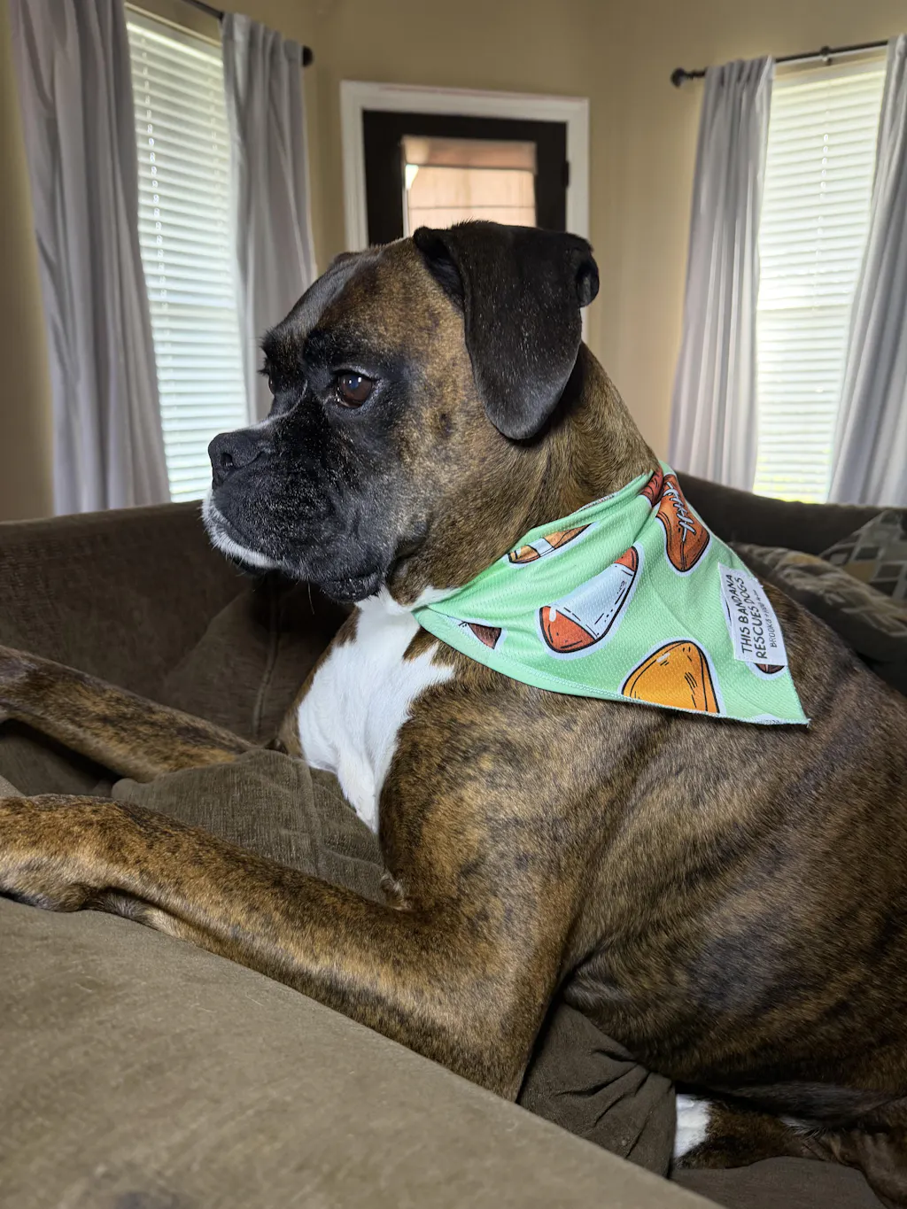 I love how the colors pop. The bandanna fits perfect around the neck and stays on really well. It also has a good texture. Bonus, it helps rescue dogs.